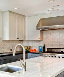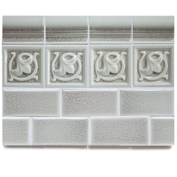 A light gray with hints of dusty rose, glass blue and mint undertones. May appear lighter on high relief and darker on lower relief.